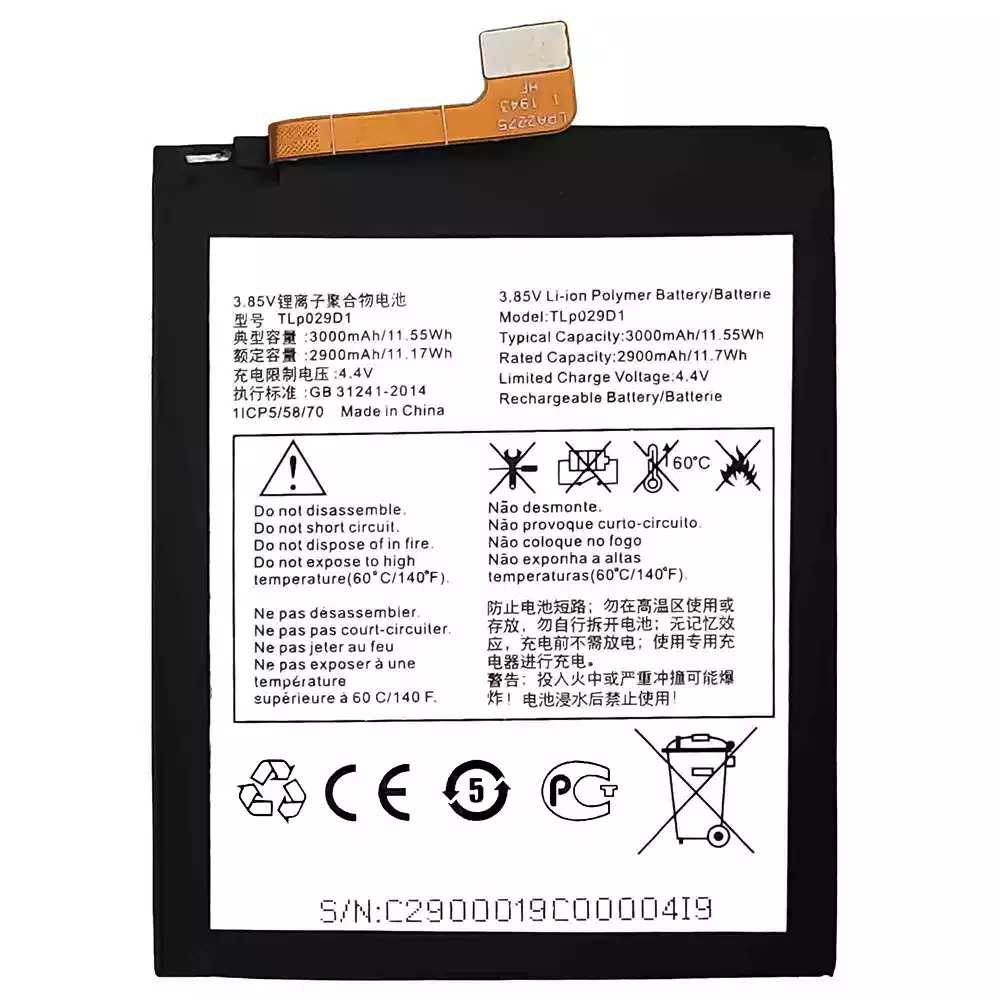 Bateria TLP029D1 do Alcatel 3 2018 / 0T-5052 / 5052D / 5052A / 5052Y / 5 / 0T-5086 / 5086D /5086Y / 5086A / 3L 2018 / OT-5034 / 3x 2018 / 0T-5058 / 50581 / 5058T / 5058Y / 5058A / 5058J